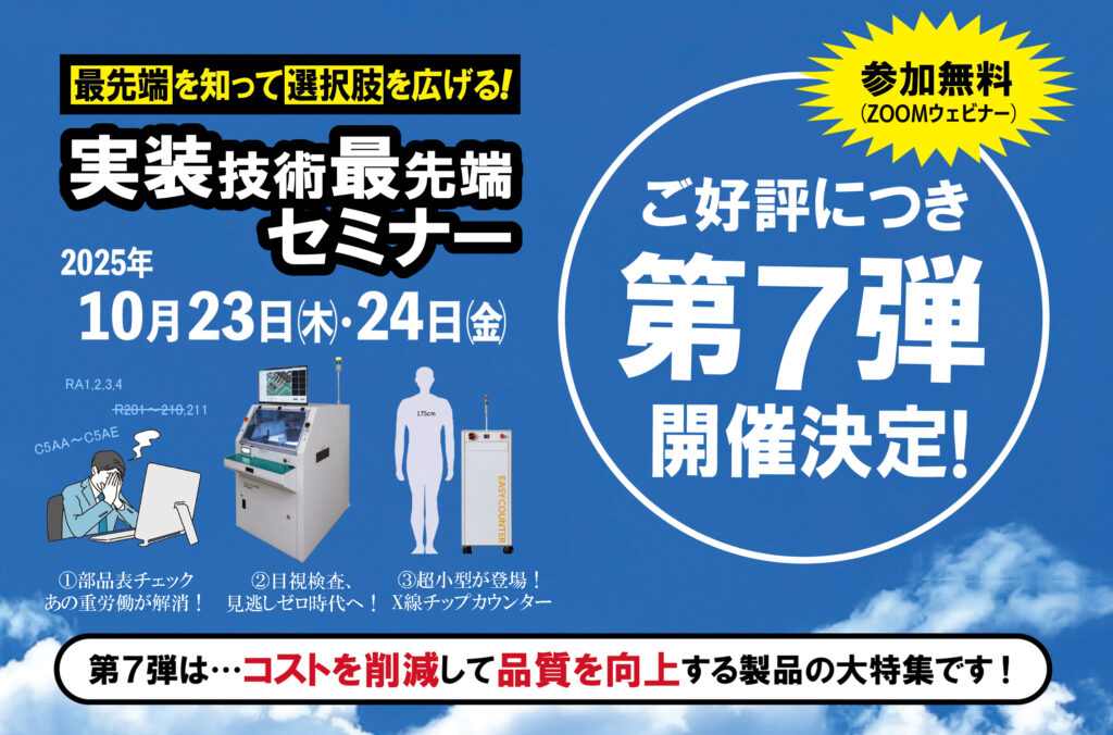 秋の訪れを感じる今日この頃、皆さまいかがお過ごしでしょうか? さて、このたび実装技術最先端セミナーの[第7弾]の開催が決定しました!皆さまから寄せられた「品質向上とコスト削減の両方を実現したい!」というお声にお応えして、 […]